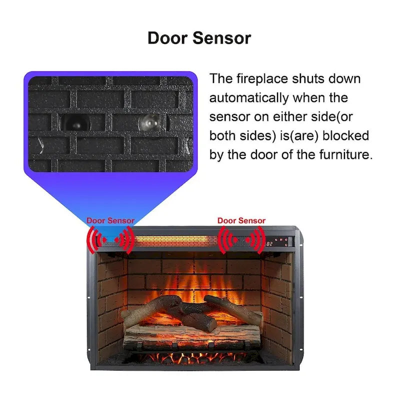 - Thoughtful Features for Safety: The door sensor feature automatically shuts off the insert when the door is close, enhancing safety and reliability. The dual control design allows you to adjust the fireplace heater either through the front panel buttons or the remote control, with overheat protection for added safety.