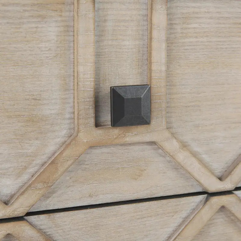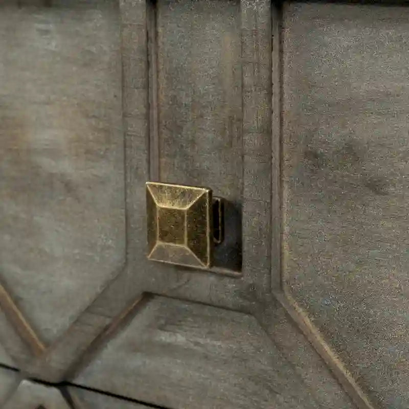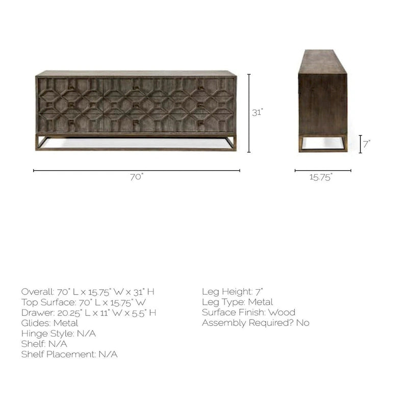 Expertly crafted fromengineeredwood and finished in a natural brown tone with a forensic eye, theGenevieve II is a gorgeous sideboard mounted atop an antiqued-gold toned iron frame that guarantees exceptional stability and balance. The front side of this amazing sideboard flaunts an amazing diamond pattern that adds to the look of the piece and is guaranteed to catch your attention from any corner of the room. In addition to its visual appeal, theGenevieve II is exceptionallyfunctional, thanks to the nine pull out drawers fitted with metal knobs that help you store everything from flatware and china to linens and accessories.