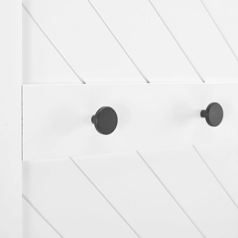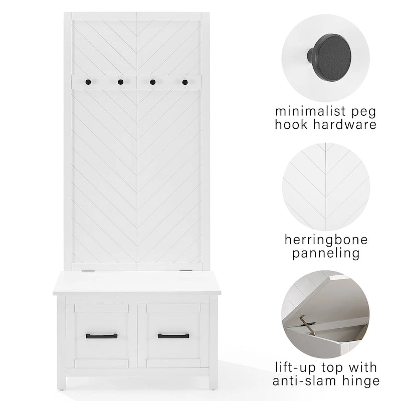 Introduce modern elegance to your entryway with the Kayce Hall Tree. This hall tree merges traditional and contemporary styles with a stunning herringbone design on the back. Covered in a white finish birch veneer, it features four metal peg hooks with a 5lb limit and a capacious lift-top storage bench that holds shoes and accessories. The bench also has faux drawer fronts and black metal hardware. The Kayce Hall Tree has adjustable levelers on legs and is perfect for mid-century modern, glam, and minimalist dcors.