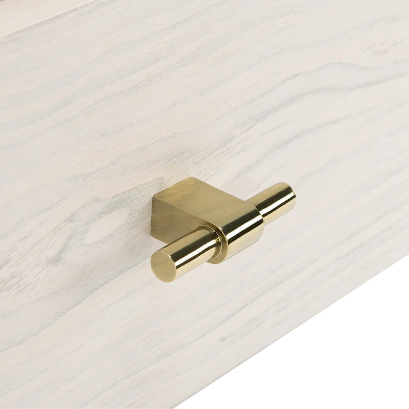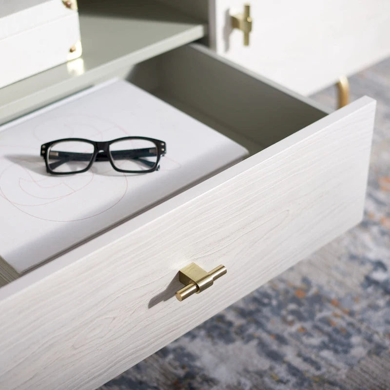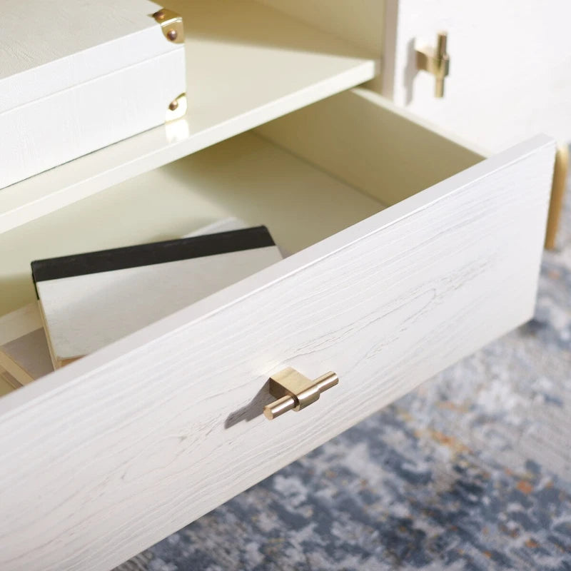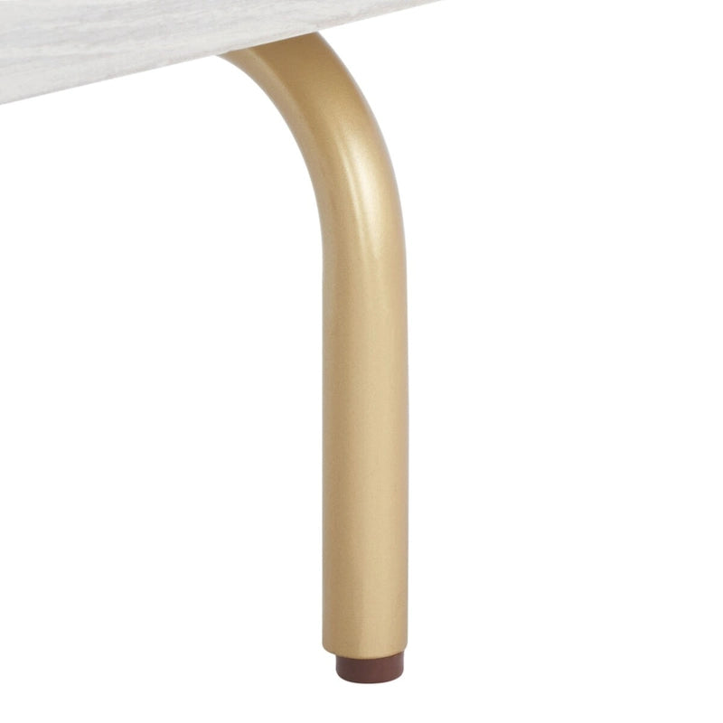 A captivating blend of luxurious materials and elegant lines, this contemporary TV stand transforms any living room into a glamorous entertainment center. Crafted of luxurious mahogany wood, a white and finish complement its rich gold legs.
