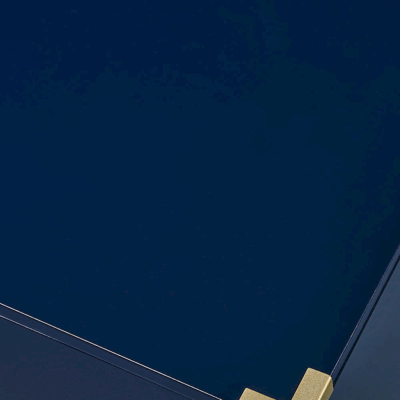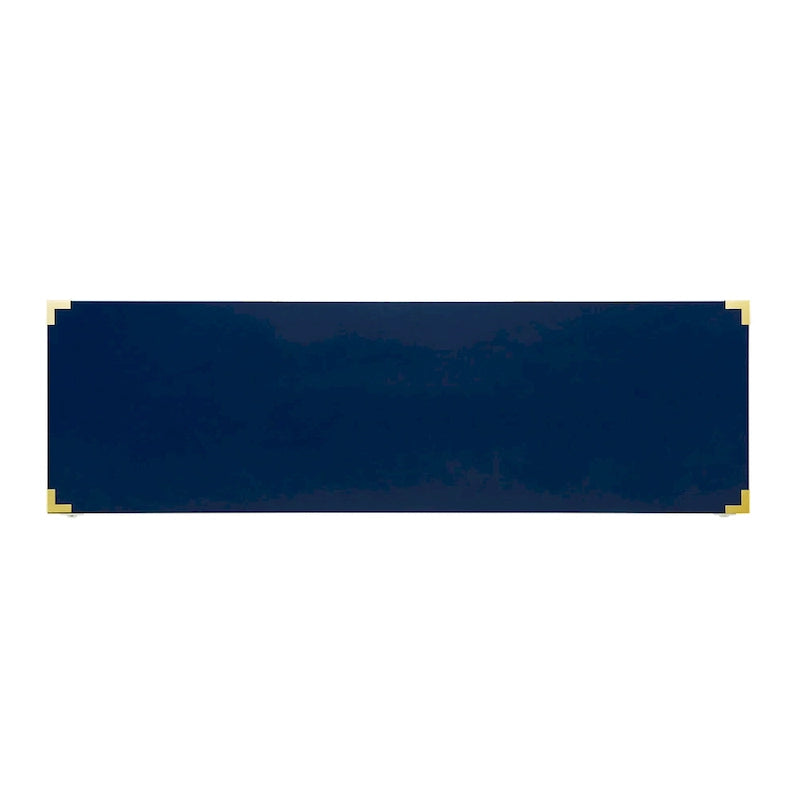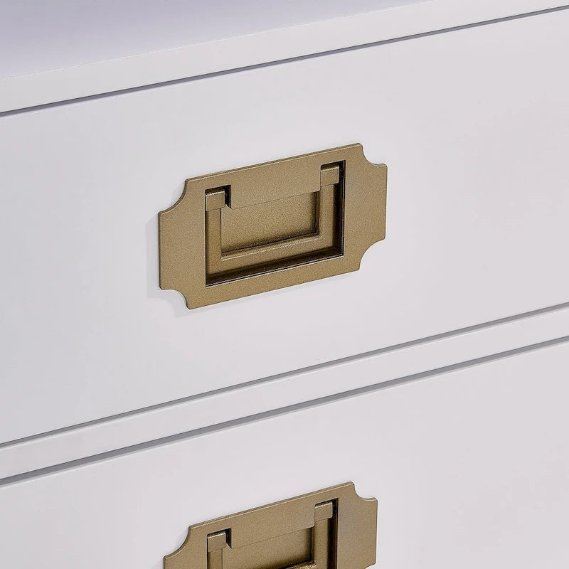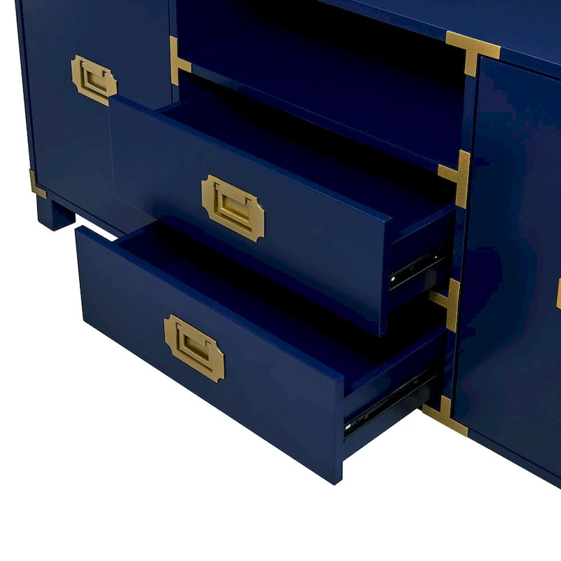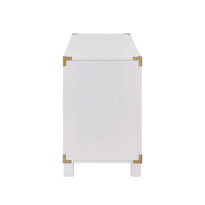 Create a stylish media TV stand with this chic storage credenza. Its charming glam brass hardware adorns the drawers and corners, contrasting with your choice of two gorgeous finishes. Two drawers in the center conceal smaller items, while the open shelf nestles any media players, not to mention handy side cabinets that offer additional storage options.
