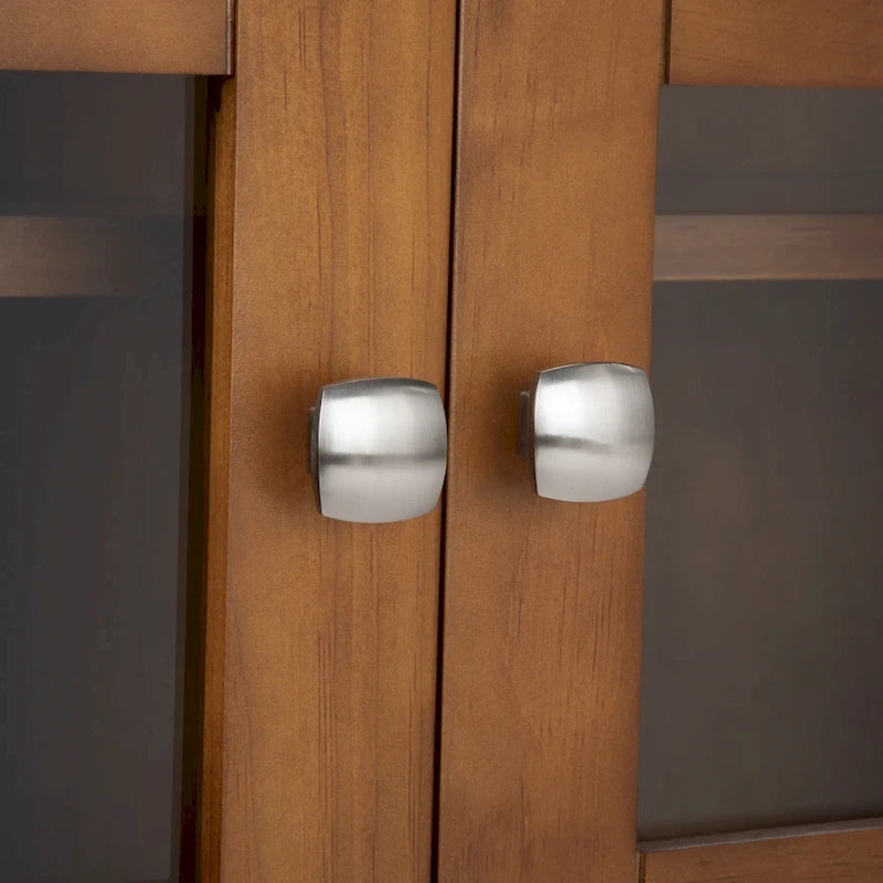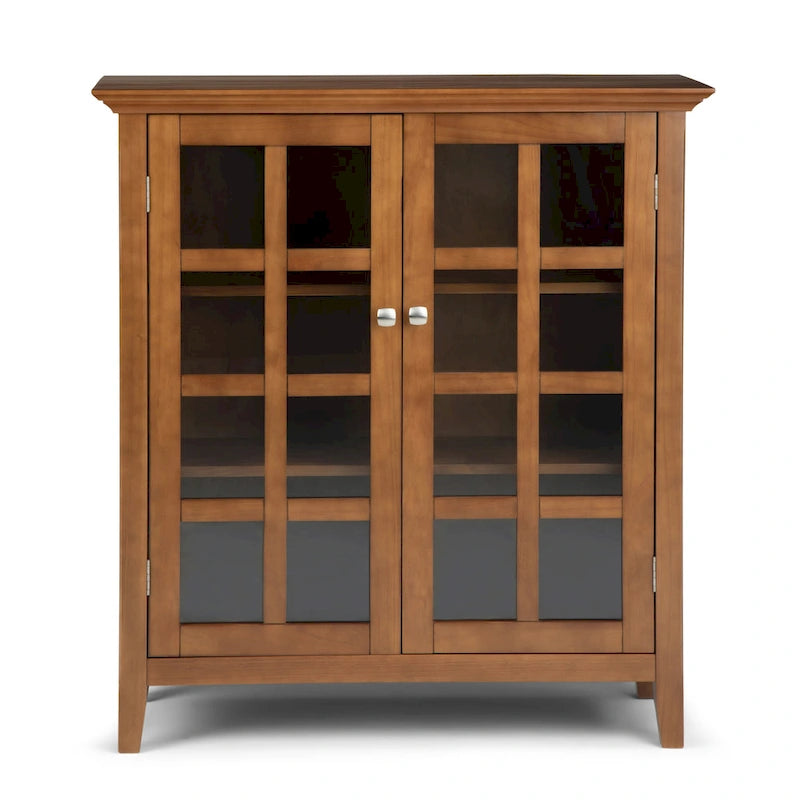 Keep your home organized while displaying your favorite items with the Normandy Medium Storage Cabinet. Handcrafted with solid wood and finished with a protective NC lacquer, this multipurpose cabinet offers plenty of functional storage in a stylish package. The cabinet features two tempered glass doors that open to reveal four adjustable shelves, allowing you to customize the layout to suit your needs. This unique piece also includes tapered legs, grooved sides, a molded crown edged tabletop, and brushed bronze knobs for added flair.